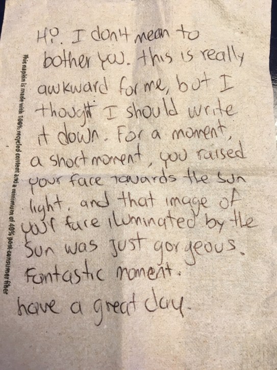 “Excuse me, this is very awkward for me, but I just wanted to give you this.” said a middle aged man with a foreign accent that I couldn’t identify. He handed me a folded up napkin. Confused and curious, I said some surprised and enthusiastic exclamation of “okay” and went to my car to read it. Here is what it said: